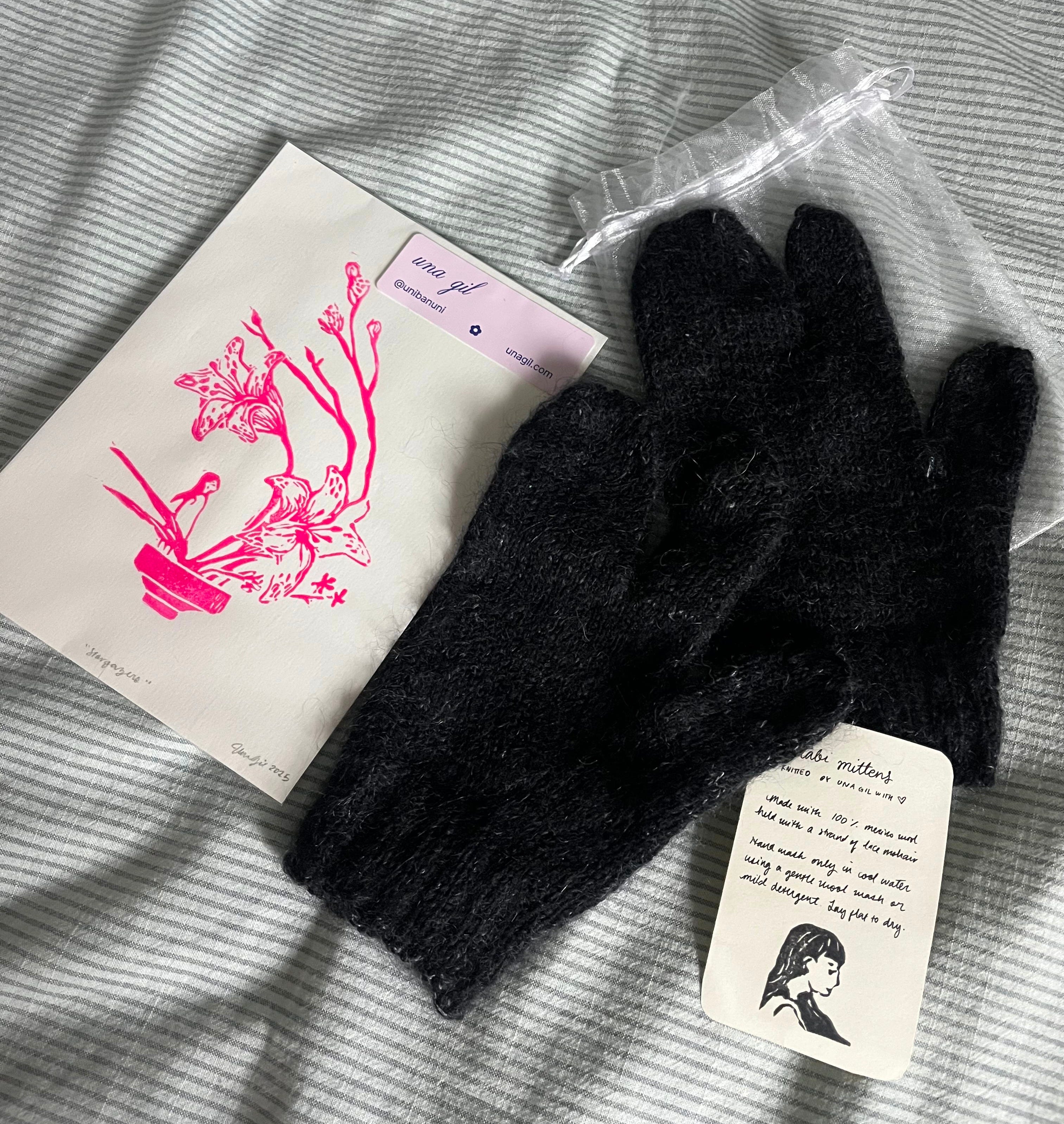 UNA GIL- @unibanuni on Instagram is a self-taught knitter and print artist based in Vancouver, British Columbia. She creates ethereal drawings and lino prints inspired by dreamy visions from her childhood. I always use the term “small world” with the internet; everything is interconnected to a certain degree. When Una and I were first chatting about doing a trade, we soon realised that we both lived in the same city. Living in proximity to each other, we decided to do an in-person trade, which was super sweet and wholesome. I contributed some baked goods, including three variations of cookies. In exchange, Una knitted me some cozy merino tabi gloves made from a composition of merino wool and marsh mohair that I love and will cherish forever. I’m constantly in awe, seeing Una’s work. There is such a strong presence of storytelling and attention to detail that transports you into a perfect, tranquil realm of Una’s mind.
