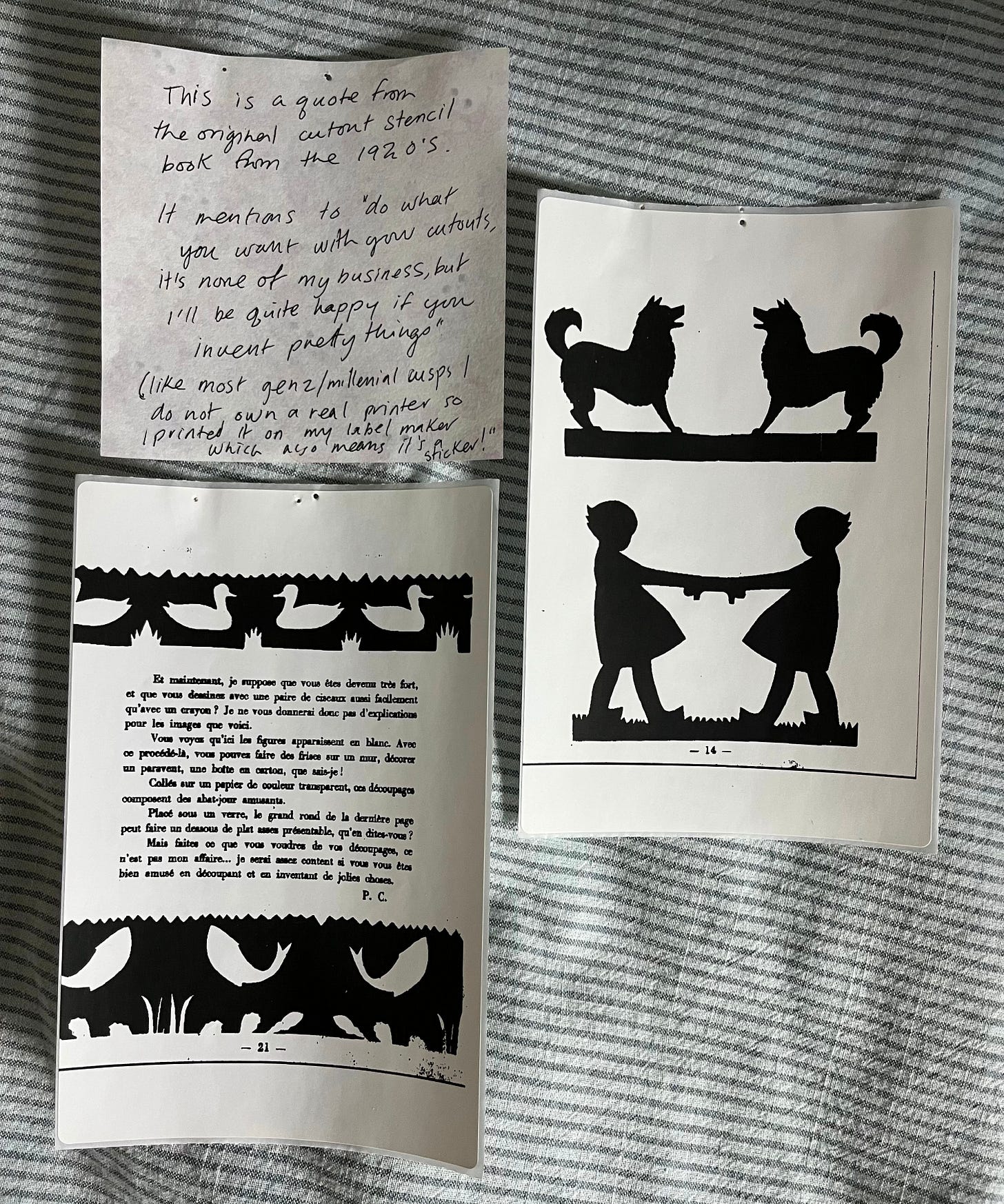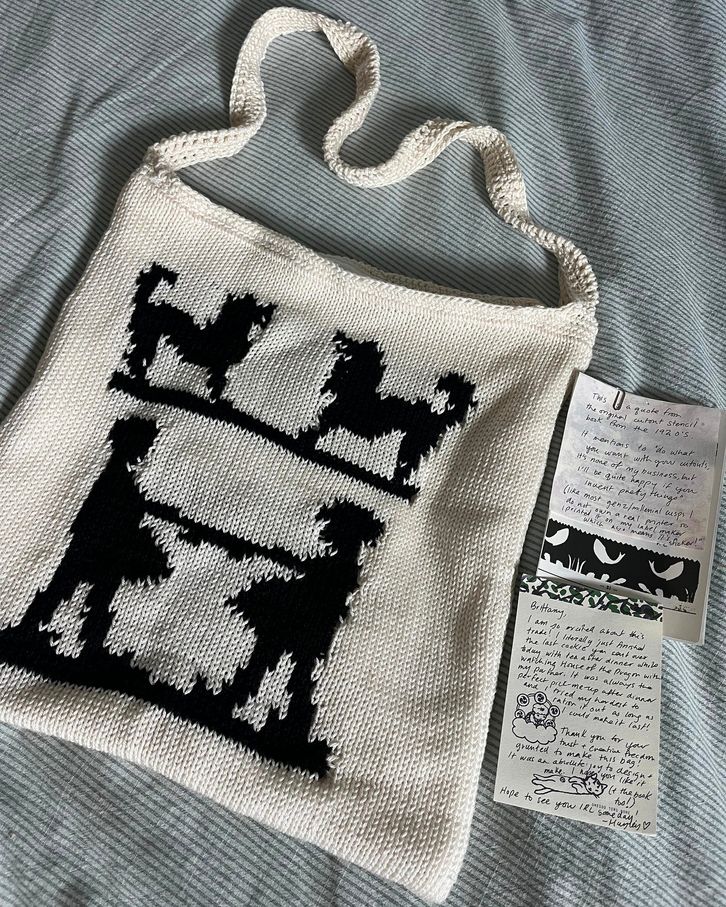 DAZY CHAINS- Hayley Mortin, known as @dazychains on Instagram, is a Canadian, Montreal-based textile artist. Hayley creates special and unique pieces conceptualized from the hidden infrastructure of artificial intelligence images buried in training data sets, visual glitches, and algorithmic mistakes. “I rework those fragments through knitting, and tactile processes to surface what usually stays unseen”. This was my first ever trade with someone I met through social media, it will forever hold a special place near and dear to my heart. I sent out an array of my favourite cookies, including orange chocolate pistachio shortbread and black sesame caramel chocolate chip cookies. In exchange, Hayley knitted me a tote bag based off archive paper cutting books featuring a Russian-born French illustrator, Nathalie Parain. The concept of combining “procedural creation with play and experimentation through paper”. I felt super inspired while doing this trade with Hayley. It was super cool looking into someone else's creativity field that I’m particularly unfamiliar with. Viewing the process of an artist's meticulous ideas and concepts unfold and transform into a physical product made me appreciate the textile world so much more.