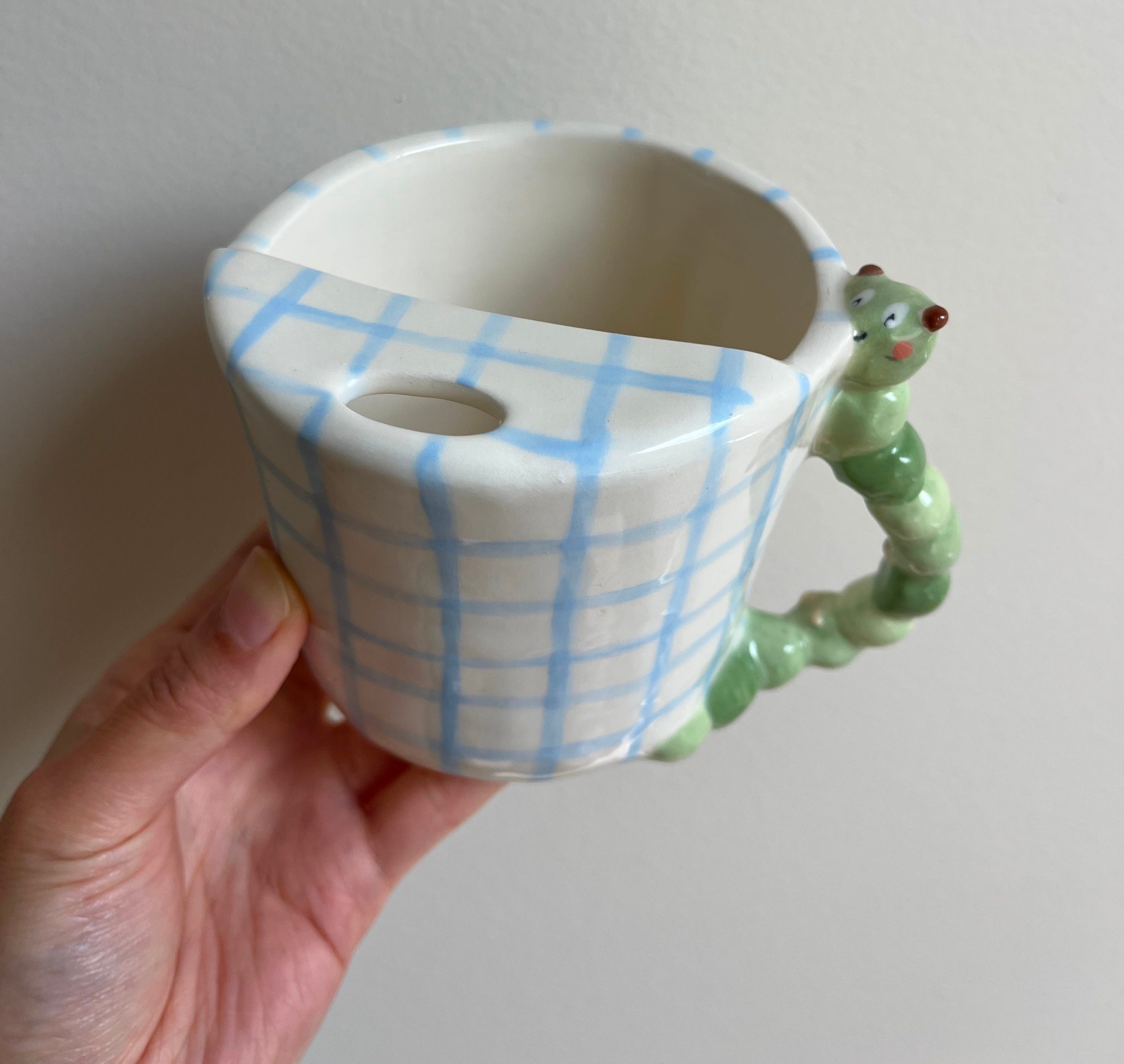 ALBA VELASCO-@Albuggin, on TikTok and Instagram, is a home ceramicist based in the United States. She is known to make whimsical, beautiful, fairy-like pieces that encapsulate nature and heal the inner child in you. I asked Alba last Summer if she would do a trade with me for some cookies; she graciously said yes. Needless to say, I was so excited. It was requested that the cookie flavours would be a surprise upon delivery, so I had to pull some inspiration from her social media. I curated matcha brownie cookies, hojicha pistachio toffee cookies, and brown butter earl grey cookies. It was to send these cookies out since some of these recipes were in the mid-final stages of recipe development at the time, so it was fun to send them off and get some feedback and as well as gifting some yummy treats. In exchange, Alba hand-built me the most darling mug with a caterpillar handle inspired by a pitcher vase I fell in love with that was displayed on her Tiktok, and I requested it to be made into mug form. Trading with Alba made me appreciate that “childhood whimsy” can still co-exist in your adulthood and bring so much joy by leaning into artistic platforms such as ceramics and pottery.